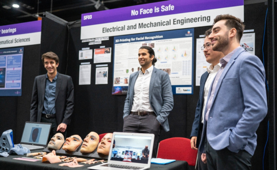 Final-year engineering students (L-R): Michael, Fouad, Sebastian and Luke present their 3D mask fabrication system at Ingenuity 2023.