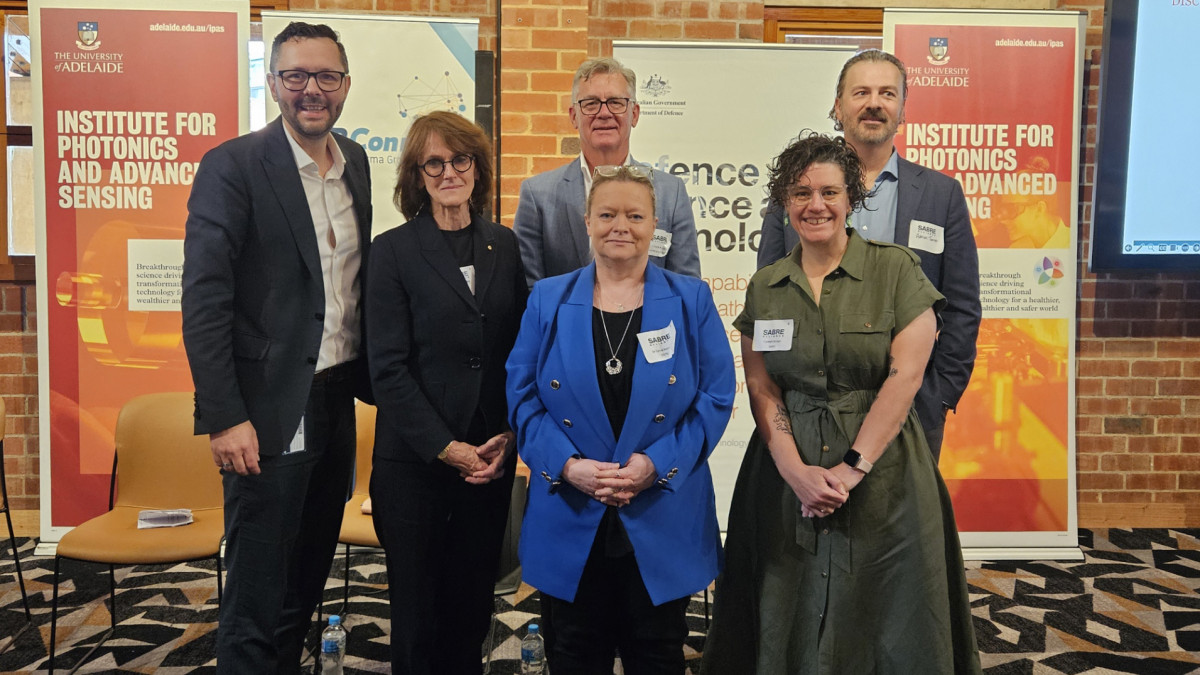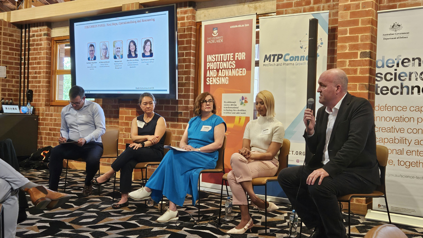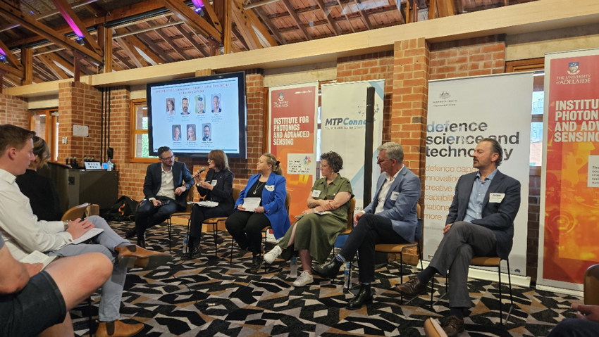 Australia's Chief Scientist Dr Cathy Foley, Chief of Sensors & Effectors Division, Defence Science and Technology Group Dr Sylvie Perreau, former Chief of Army Rick Burr, CE of SARDI Dr Hannah Brown and CEO ExoFlare Pty Ltd Adrian Turner led the discussion which was facilitated by Director of Institute for Photonics and Advanced Sensing, Prof Mark Hutchison.