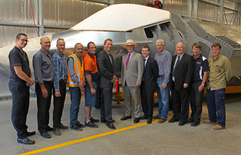 Minister Snowdon poses with DSTO personnel in front of the Iron Bird.