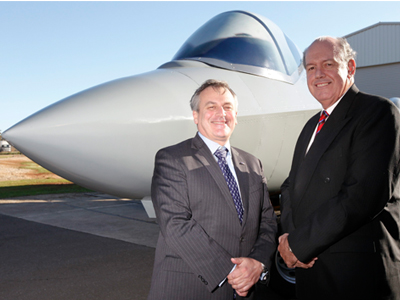 Chief Defence Scientist Dr Alex Zelinsky (left) with Senator the Honourable David Johnston, Minister for Defence in front of the F-35 Iron Bird at the unveiling ceremony.