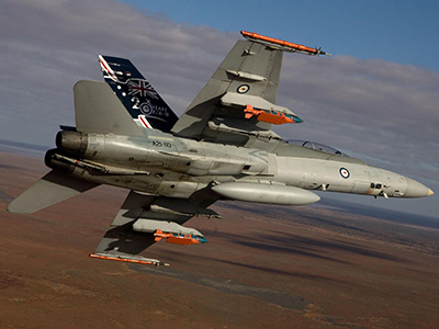 A Royal Australian Air Force F/A-18 Hornet in flight with two JDAM-ER 500lb bombs and two Time Space Position Information pods.