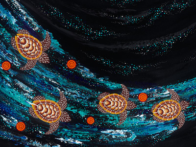 The artwork depicts Gurreng Gurreng people singing up to the Seven Sisters at a turtle nesting site in Mon Repos, Bundaberg. The Seven Sisters (also known as The Pleiades star constellation) safely guide turtles into shore to lay their eggs – ensuring continued abundance of turtles in the area.