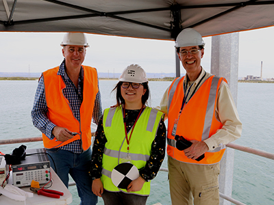 After refining the system, the scientists travelled to HMAS Stirling to point their SPAD sensor off the side of a boat out to sea. They also took the opportunity to measure the open water transparency using Secchi disks. These are pizza-sized disks painted with alternating black and white quadrants, and are lowered into a body of water until no longer visible. This depth of disappearance, called the Secchi depth, is a measure of the transparency of the water.