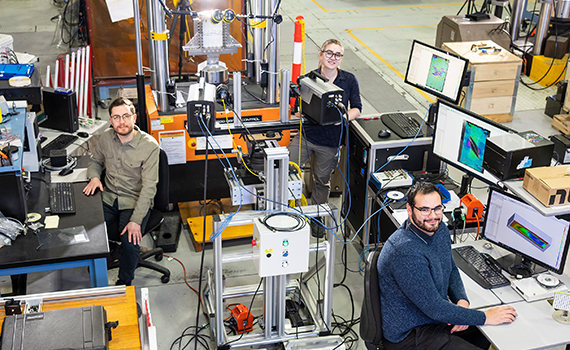 Lachlan Burgess-Orton (DSTG), Patrick Frezza (ACS-A), Greg Beziuk, Claire Dunne and Michael Forsey (RMIT University), and Kasi Metcalfe and Loc Tran (QinetiQ) have used multiple ultra-high-speed cameras and digital image correlation (DIC) techniques to gather three-dimensional strain data of composite panel surfaces as they fail under compressive loading. Prior to testing, the test specimen had been painted with a randomised black dot (speckle) pattern against a white background. The DIC imaging system monitors the change in distance between the dots (at a prescribed frame rate) and then calculates strain as the specimen is loaded and deformation takes place. Together, the team developed an optimised speckle pattern and test setup that would enable both high speed and low speed image data to be captured from the same test. This high-speed strain imagery is a rich source of information for researchers trying to model failure of composite structure.